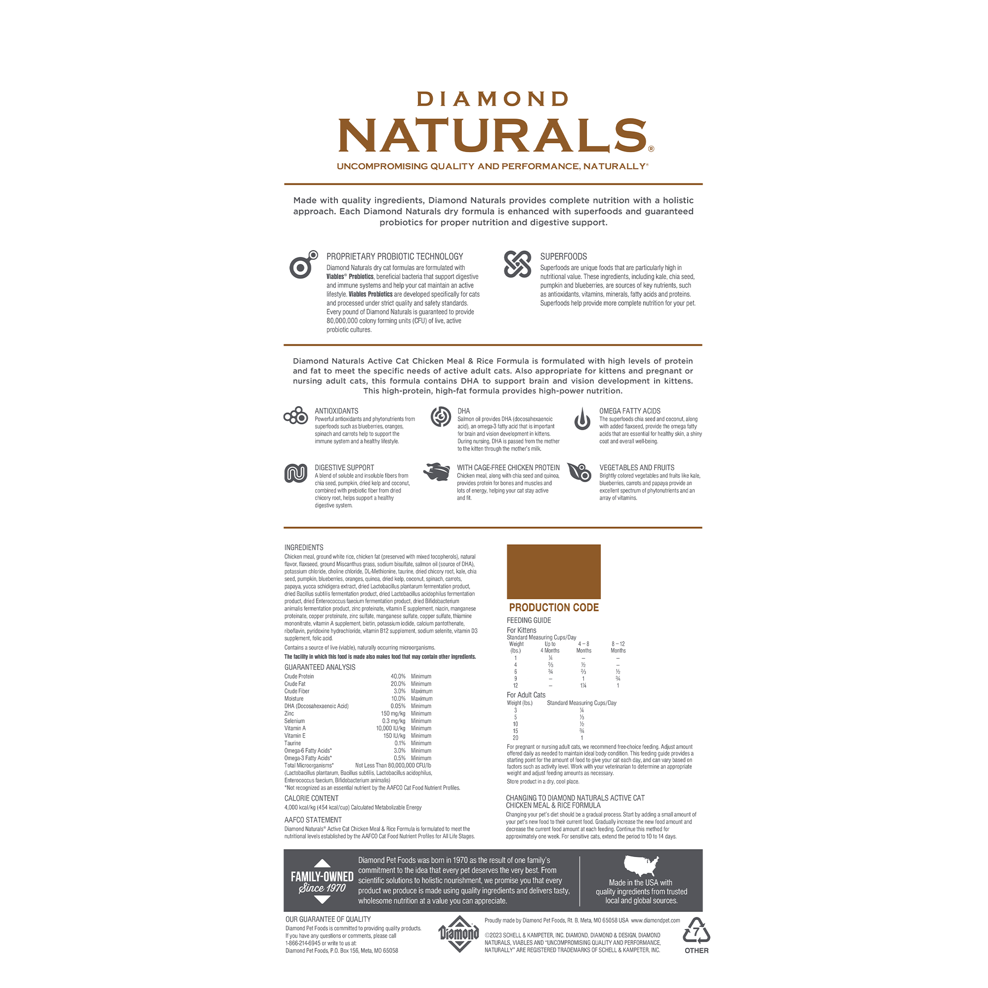 ไก่ป่น, ข้าวเจ้าป่น, ไขมันไก่ ( ผสมวิตามินอีเป็นสารถนอมคุณภาพอาหารสัตว์ ) , กลิ่นรสธรรมชาติ , เมล็ดปอ, เซลลูโลสผง, โซเดียม ไบซัลไฟต์, น้ำมันปลาแซลมอน, โพแทสเซียม คลอไรด์, โคลีน คลอไรด์, ดีแอล-เมไทโอนีน, ทอรีน, รากชิคอรี่แห้ง, ผักคะน้า, เมล็ดเจีย, ฟักทอง, บลูเบอรี่, ส้ม, ควินัว , สาหร่ายทะเลแห้ง, มะพร้าว, ผักโขม, แครอท, มะละกอ, สารสกัดยัคค่า ชิดิเจร่า, สารที่ได้จากการหมักของเอนเทอโรค๊อกคัส ฟิเซียม, สารสกัดที่ได้จากการหมักของไบฟิโดแบคทีเรียม แอนิมาลิส, ซิงค์ โปรติเนท, วิตามินอี ไนอะซิน, แมงกานิส โปรติเนท, คอปเปอร์ โปรติเนท, ซิงค์ ซัลเฟต, แมงกานิส ซัลเฟต, คอปเปอร์ ซัลเฟต, ไธอามิน โมโนไนเตรท, วิตามิน ไบโอติน, โพแทสเซียม ไอโอไดท์, แคลเซียม แพนโทธีเนต ไรโพฟลาวิน, ไพริด็อกซิน ไฮโดรคลอไรด์ (วิตามินบี 6 ), วิตามินบี 12, แมงกานิส อ็อกไซด์, โซเดียม ซีเลไนท์, วิตามินดี, กรดโฟลิก